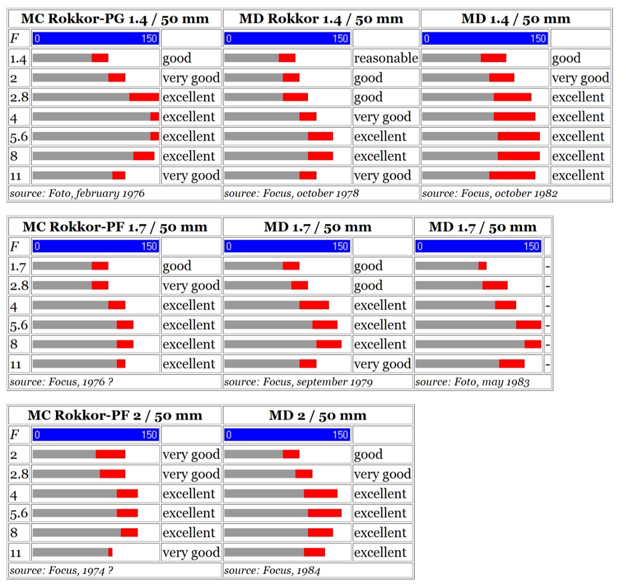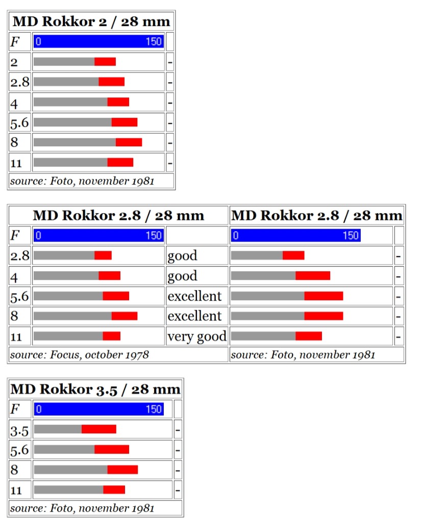 这些镜头测试结果摘自旧版的荷兰摄影杂志(《Focus》和《Foto》;每项测试的来源见底行)。在七八十年代,镜头测试通常是通过在高分辨率黑白胶片上拍摄测试图,并通过计算底片上每毫米的线条数来确定镜头的分辨率。尽管很难将这些测试结果与更现代的调制传递函数(MTF)测试进行比较,但它们仍能让读者对镜头的光学质量有一个大致的了解。